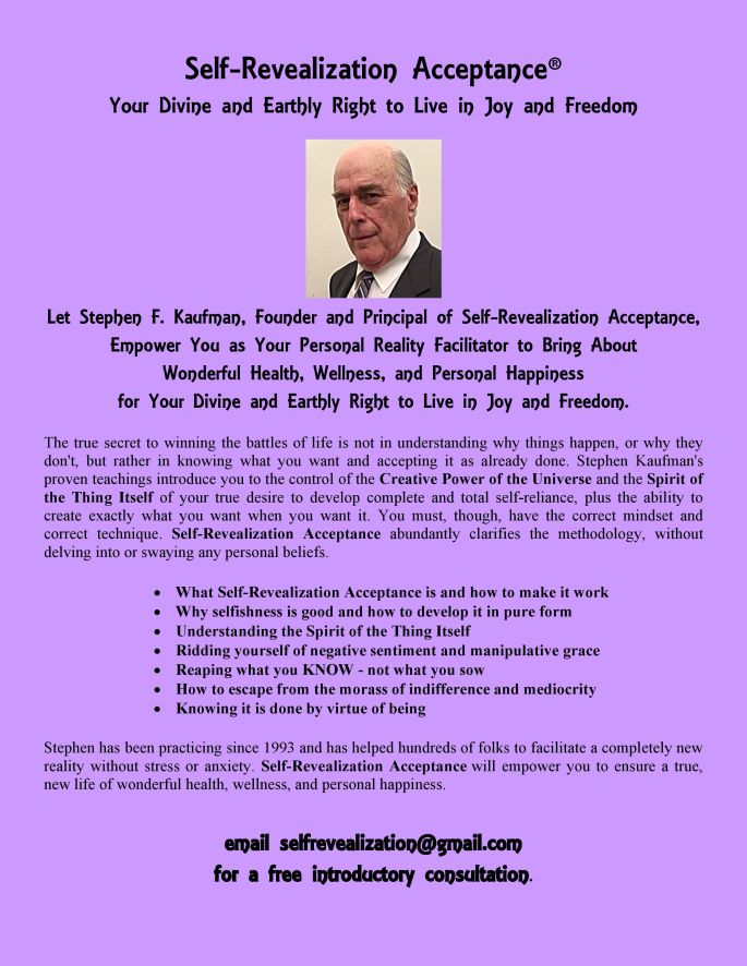 Self-Revealization Acceptance, in conjunction with the Spirit of the Thing Itself, is realistic, practical, and proven. The method explains, in terms easy to understand, how every person is all-powerful and can attain anything desired if the desire is realistic and not based on frivolous fantasy when you understand and accept the ability and necessity to command the Creative Power of the Universe. Self-Revealization Acceptance is applicable to all things: religious, secular, mundane, or heavenly. It does not interfere with your primary belief system unless you want it to do so.